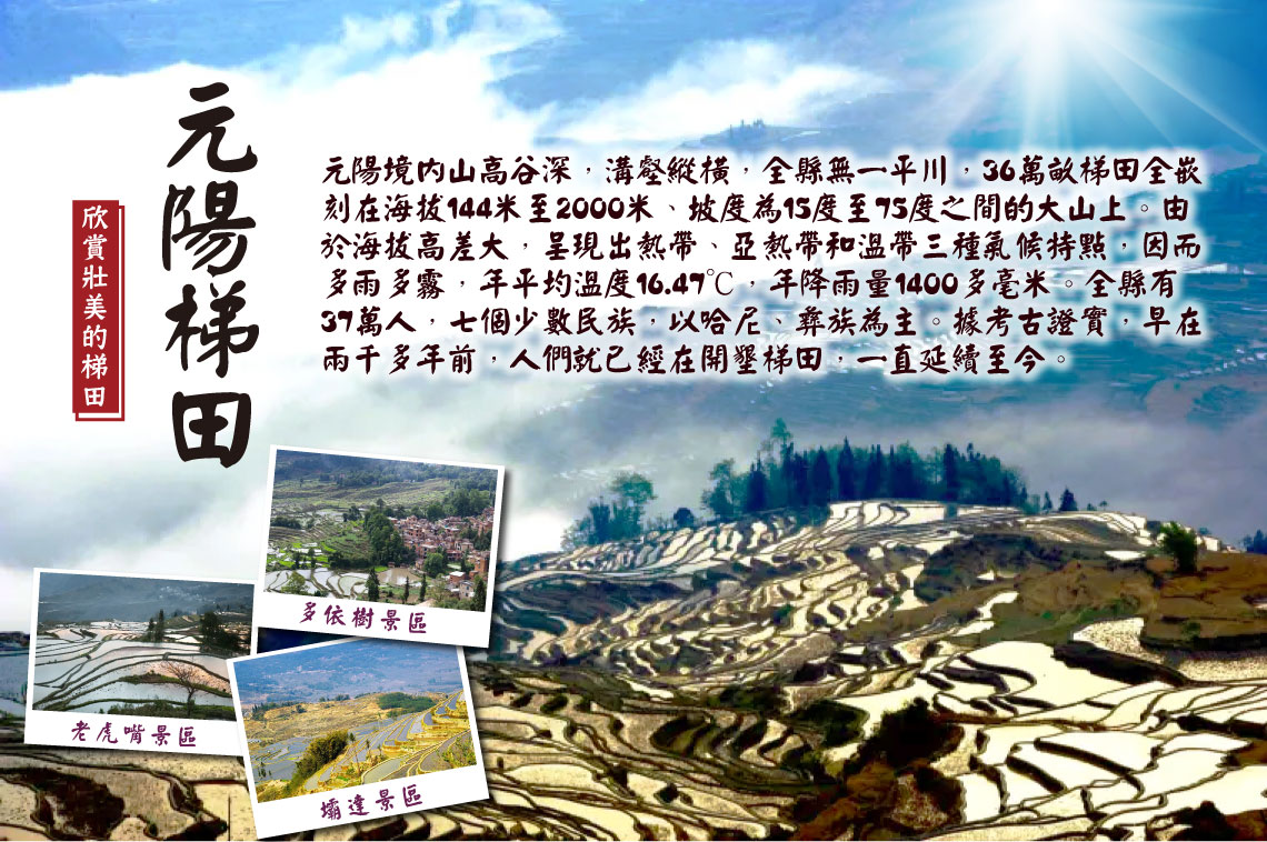 【元陽梯田風景區】是哈尼族人世世代代留下的傑作。元陽梯田是紅河哈尼梯田的核心區。元陽哈尼族開墾的梯田隨山勢地形變化,因地制宜,坡緩地大則開墾大田,坡陡地小則開墾小田,甚至溝邊坎下石隙也開田,因而梯田大者有數畝,小者僅有簸箕大,往往一坡就有成千上萬畝。
