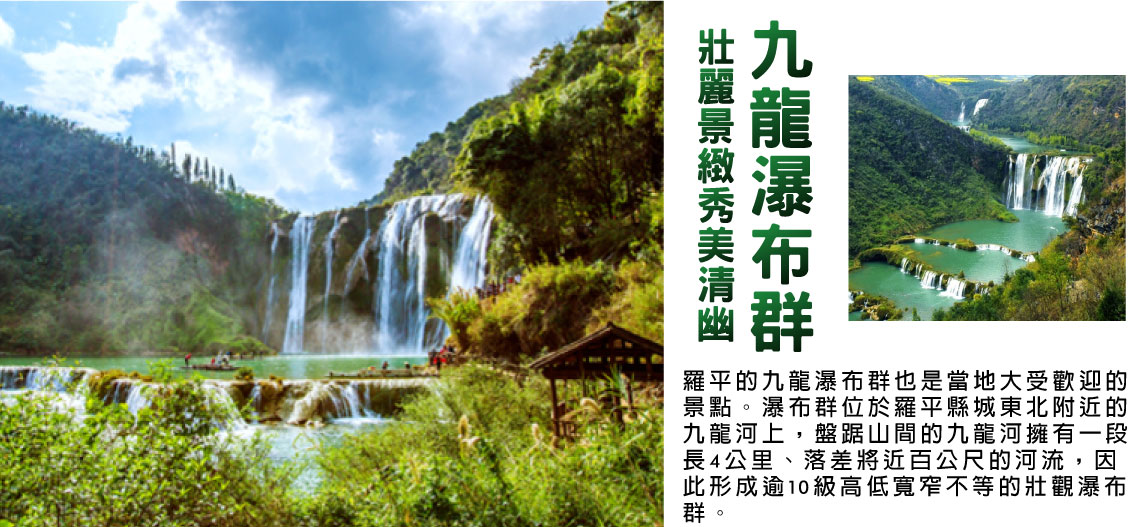 【九龍瀑布】九龍十瀑之間,以淺灘或深潭相連,形成了一串輝映太陽光芒的明珠彩帶。這些瀑布隨著季節的更替變化,變幻無窮,令人目不暇接。豐收季節,數裏之外,便會聽到大瀑布的轟然響聲。大大小小的瀑布,或細柔若絲,仿佛一根根絲線在隨風飄舞,或水花翻滾,波光閃爍,或似天河瀉落,勢如雷霆萬鈞,震撼山河,或魚群弄瀑搶水,景致迷人。從民革村往下500公尺,便進入了九龍大瀑布景區。首先看到的是碧日灘,清澄平靜。灘下有河心小島,將水分成三股,形成三個寬窄不等,高約2公尺的小疊水,這是九龍十瀑中的第一瀑。此瀑細柔若絲,仿佛一根根絲線在隨風飄舞。河心島上蘆葦叢生,時有魚群弄瀑搶水,景致十分迷人。由此拾級而上,是一座鈣化天生橋,潺潺細流從橋兩側漫人潭內,與橋下的疊水匯成一月牙形鈣化灘。此潭名月牙湖。在九龍瀑布僅4公里長的河道上,便有大小數十個鈣化灘和十多級瀑布,形狀奇特,植被完好,在國內也屬罕見。沿著瀑布邊陡峭的石階路,攀上瀑布頂,回首俯視,碧日潭、月牙湖、戲水灘、鈣化疊水盡收眼底。這裏居住著布依族。