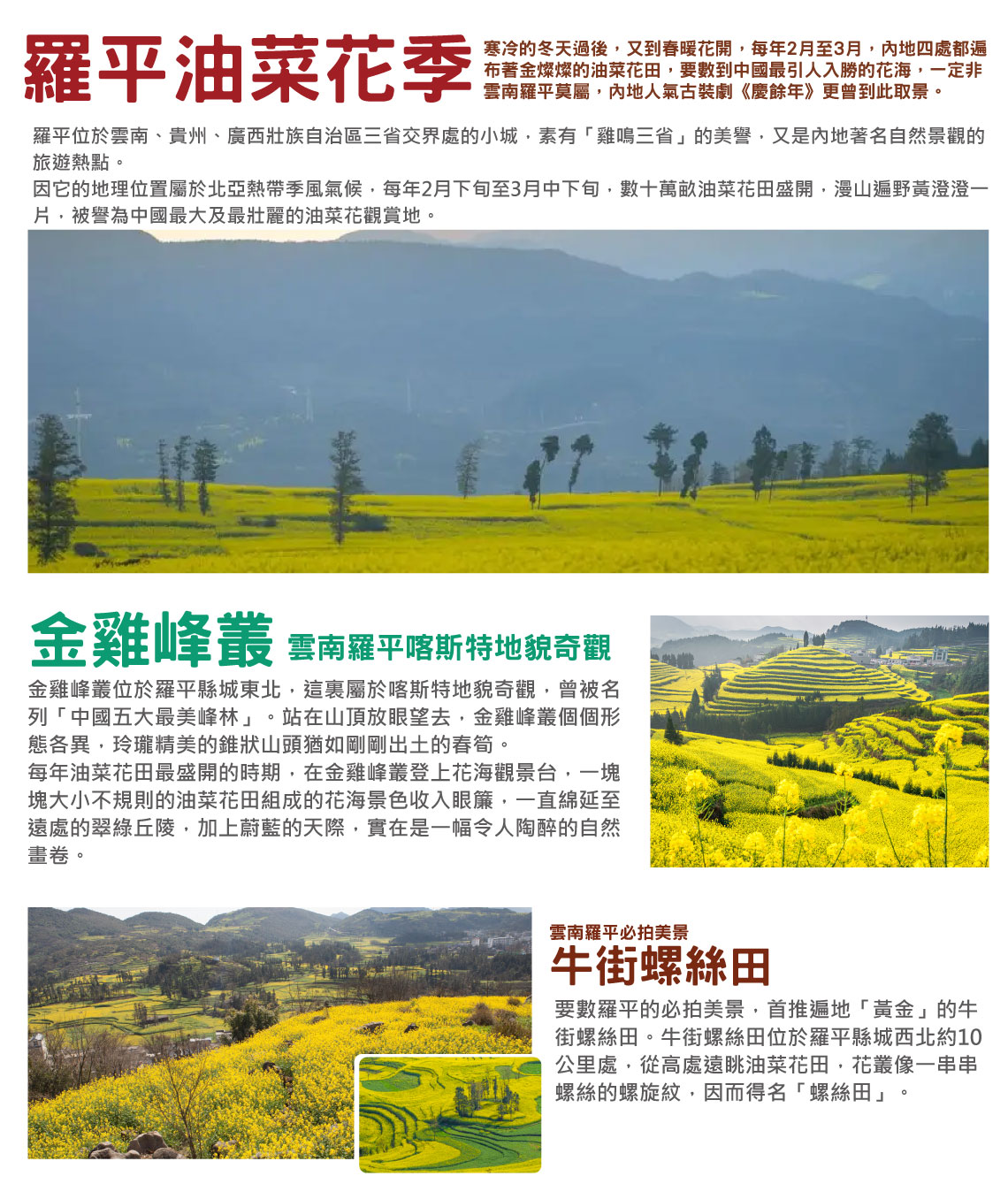羅平油菜花田:中國四大油菜花觀景地之一,由於它地處北回歸線之南,於是它也成為每一年中國內地油菜花最先綻放的地方。尋找蛇年的第一抹春色,就在油菜花最先綻放的地方。油菜花花季時,成畦成片的金黃色漫開來,淹沒著田野村莊和房屋,晴朗的潮濕空氣中似飄滿了花粉般質感的微塵,讓人領略到高原花海的萬種風情,把你的心情,把你的思緒,把你的夢想,都染得金燦燦的。羅平的油菜花鋪天蓋地,漫山遍野,盛開得一塌糊塗,香氣飄蕩在空氣裡,揮之不去,躲閃不開。