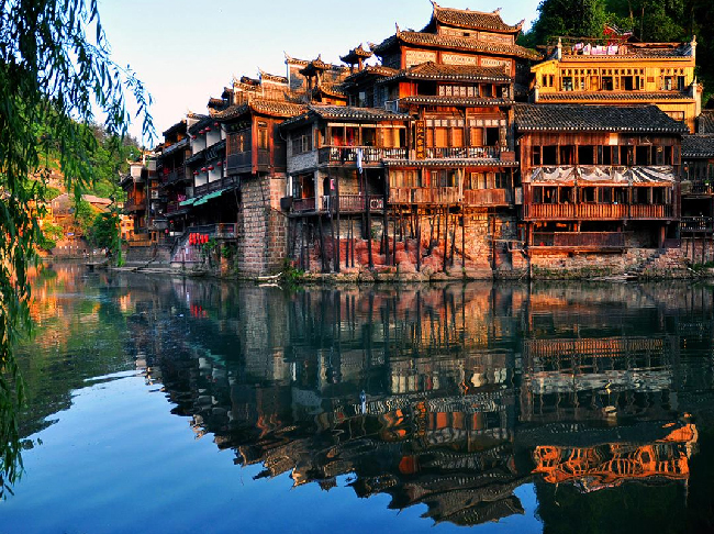 是湘西土家族苗族自治州的鳳凰縣的縣城,它緊鄰沱江而建,吊腳木樓布滿山坡。這裏是文學大師沈從文的故鄉,他曾在《邊城》中描繪過它素樸而迷人的風情。