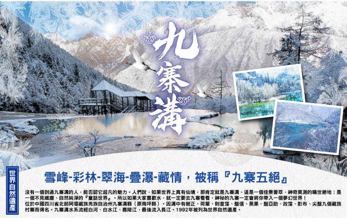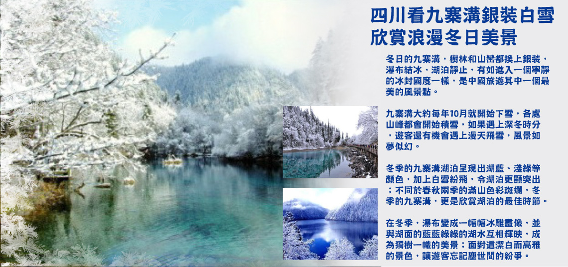 註3:九寨溝海拔約3000米,屬高原濕潤氣候,山頂終年積雪。春天氣溫較低且變化較大,平均氣溫多在9℃至18℃之間,4月前有凍土及殘雪,建議不論何時前往都需備厚外套;夏天氣溫回升較快且穩定,平均氣溫在19℃至22℃,夜晚較涼,宜備薄毛衣;秋季天高氣爽、氣候宜人,氣溫多在7℃至18℃,晝夜溫差較大,到了夜晚就得穿毛衣甚至防寒服了;冬季較寒冷,氣溫多在0℃以下。