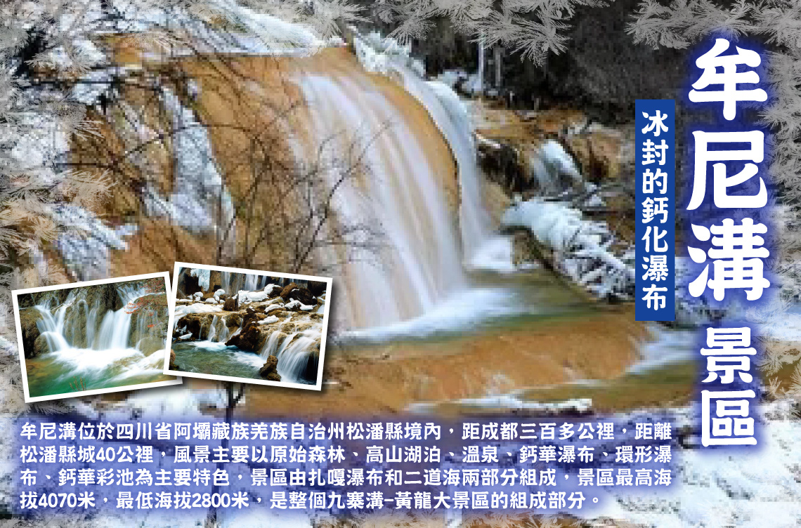 【牟尼溝紮嘎瀑布】風景區位於松潘縣西南牟尼鄉境內。占地面積160平方公里,最低海拔2800米,最高海拔4070米,年平均氣溫約4度。2011年頂峰國際旅遊規劃專案。景區內山、林、洞、海等相應成輝,林木遍野,大小海子可與九寨彩池比美,鈣化池瀑布可與黃龍“瑤池”爭輝。主要景點有:紮嘎瀑布、牟尼森林、百畝杜鵑等。