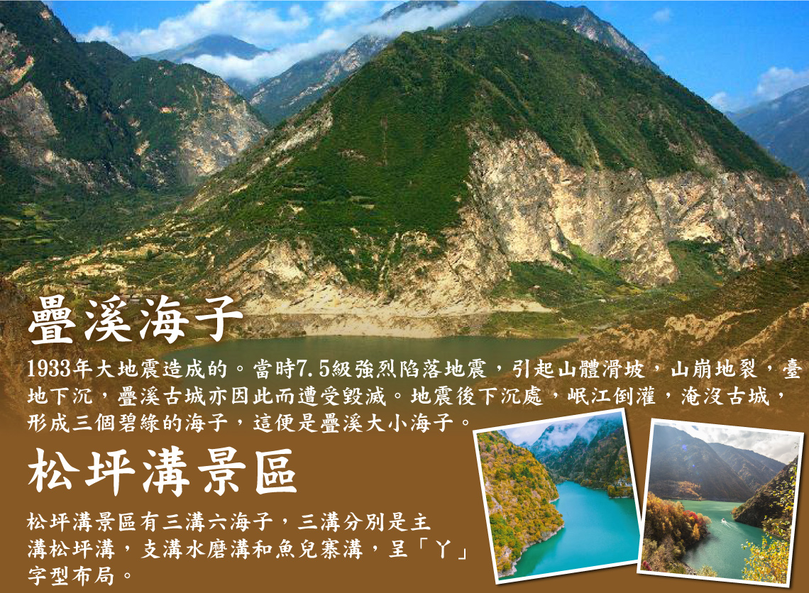 【疊溪海子】位於中國最大的羌族聚居地阿埧藏族羌族自治州茂縣境內,岷江上游岷山腳下,是世界自然遺產九寨溝、黃龍旅遊沿線一道獨特的風景線年8月25日疊溪發生7.5級地震,疊溪城中心部分在劇震發生的幾分鐘內幾乎筆直地陷落,呈單條直梯狀地震的下滑距離達500-600米。疊溪城及附近21個羌寨全部覆滅.四周山峰崩塌;堵塞岷江;形成11個堰塞湖,傷亡人數近萬人,這就是歷史上著名的“中國疊溪大地震”;疊溪海子就是由於這次大地震而形成,其最深處達98米,平均深度82米,蓄水量達1.5億立方米,湖面面積350多萬平方米,看著眼下這長達12公里的情邀海子,不知是喜還是悲,疊溪~一個曾被毀滅的小城,災難降臨的那一天,一場地震掩埋了一座城,折斷了一條江,但也留下一份補償;不久;倖存下來的人發現了這一串高原堰塞湖。稱它們為“疊溪海子”,登上高聳於湖畔的雕樓,俯瞰全景,帶狀的水面灑滿金色的陽光,令人迷醉,幾乎忘記隱藏在寧靜與碧綠中的那次災難,幸好有怪石林,那是地震滾落堆積後;在岸坡上留下的又一景觀。