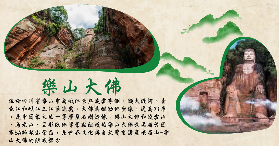 【樂山大佛遊江】又名淩雲大佛,位於四川省樂山市南岷江東岸淩雲寺側,瀕大渡河、青衣江和岷江三江匯流處。大佛為彌勒佛坐像,通高71米,是中國最大的一尊摩崖石刻造像。樂山大佛開鑿於唐代開元元年(713年),完成於貞元十九年(803年),歷時約九十年。樂山大佛和淩雲山、烏尤山、巨形臥佛等景點組成的樂山大佛景區屬於國家5A級旅遊景區,是世界文化與自然雙重遺產峨眉山-樂山大佛的組成部分。