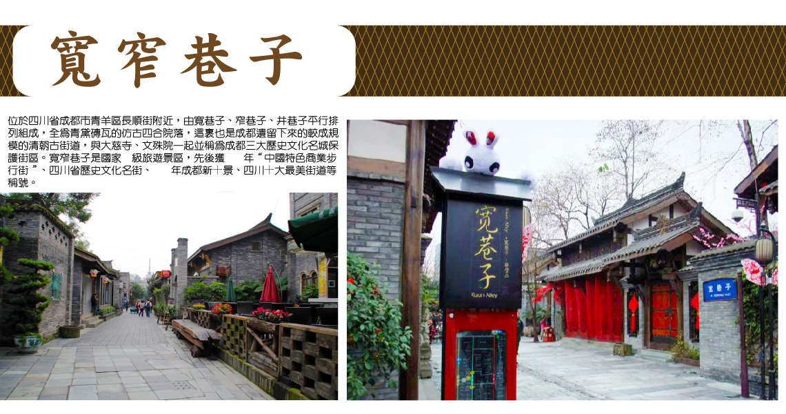 【寬窄巷子】巷子與窄巷子是成都這個古老又年輕的城市往昔的縮影,一個記憶深處的符號。當你伴著夕陽,望著炊煙,走在黃昏中的巷子裡,一種久違的老城區市民化生活場景就會一一浮現在眼前。而這久違的生活所濃縮的,就是當地原住民原汁原味的生活,儘管小巷潮濕、破舊、低窪,散發出絲絲黴味。走在凹凸不平的小巷,看著斑駁的老牆,牆上不知名的小草在風中搖曳,與自然那麼貼近,呼吸那麼舒暢,懷舊的情緒油然而生。如今, 寬巷子、窄巷子已經很難尋覓往昔的原汁原味,但你從那些保存下來的老牆、門洞、古樹依稀看見成都原住民的生活狀態。