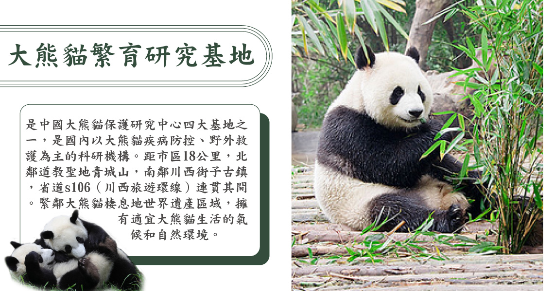 【成都大熊貓研究繁育基地】位於四川省成都市成華區熊貓大道1375號,是世界著名的大熊貓遷地保護基地、科研繁育基地、公眾教育基地和教育旅遊基地。利用山體沖溝及溪流形成山地溪穀多層次景觀帶;根據熊貓主題特點,將專案總體劃分為多個區域。截至2020年末,大熊貓種群數量達215只,是全球最大的圈養大熊貓人工繁殖種群。