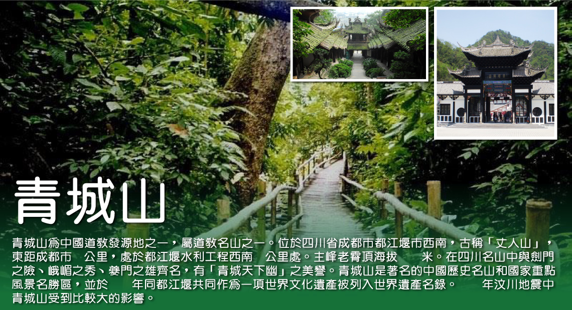 【青城山】為中國道教發源地之一,屬道教名山之一。主峰老霄頂海拔1600米。在四川名山中與劍門之險、峨嵋之秀、夔門之雄齊名,有「青城天下幽」之美譽。青城山是著名的中國歷史名山和國家重點風景名勝區,並於2000年同都江堰共同作為一項世界文化遺產被列入世界遺產名錄。