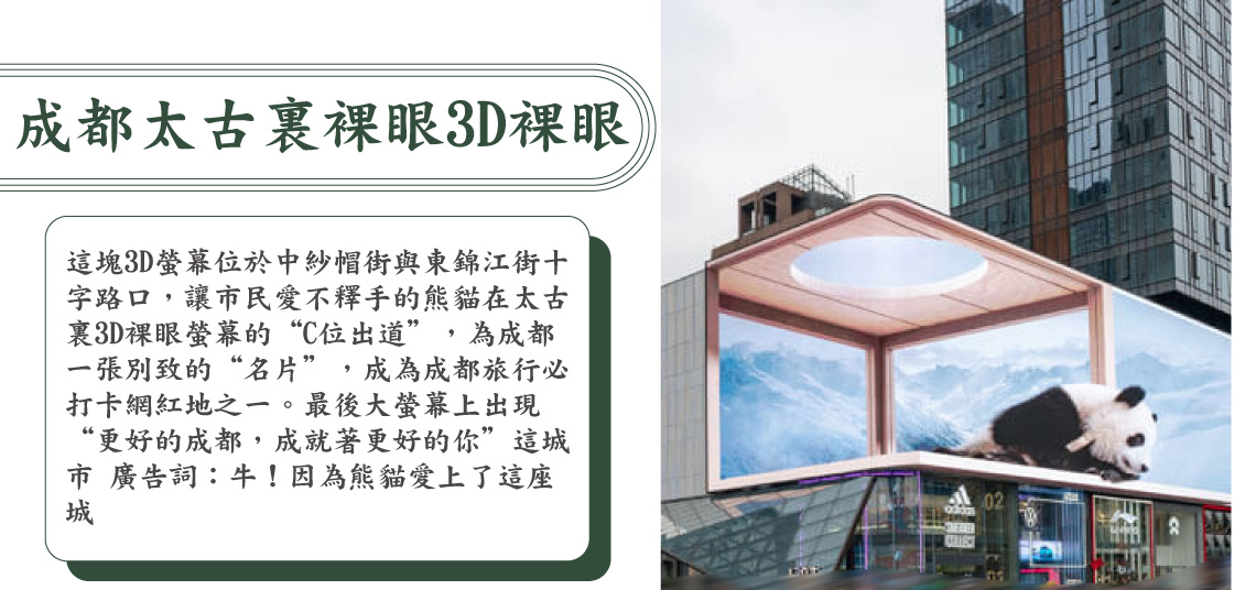 【成都太古裏裸眼3D裸眼】這塊3D螢幕位於中紗帽街與東錦江街十字路口,讓市民愛不釋手的熊貓在太古裏3D裸眼螢幕的“C位出道”,為成都一張別致的“名片”,成為成都旅行必打卡網紅地之一。最後大螢幕上出現“更好的成都,成就著更好的你”這城市 廣告詞:牛!因為熊貓愛上了這座城。