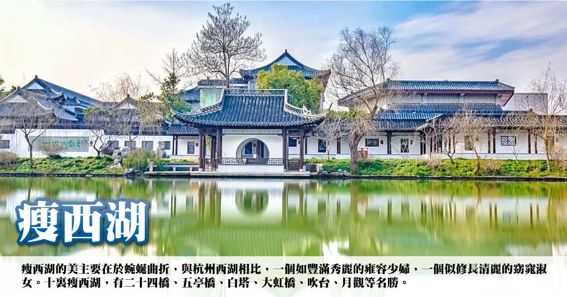 【瘦西湖】瘦西湖的美主要在于蜿蜒曲折。十里瘦西湖,有二十四橋、五亭橋、白塔、大虹橋、小金山、徐園、吹台、月觀等名勝。瘦西湖以“瘦”為特征,湖面時寬時窄,兩岸林木扶疏,園林建筑古朴多姿,行船其間,景色不斷變化,引人入勝。